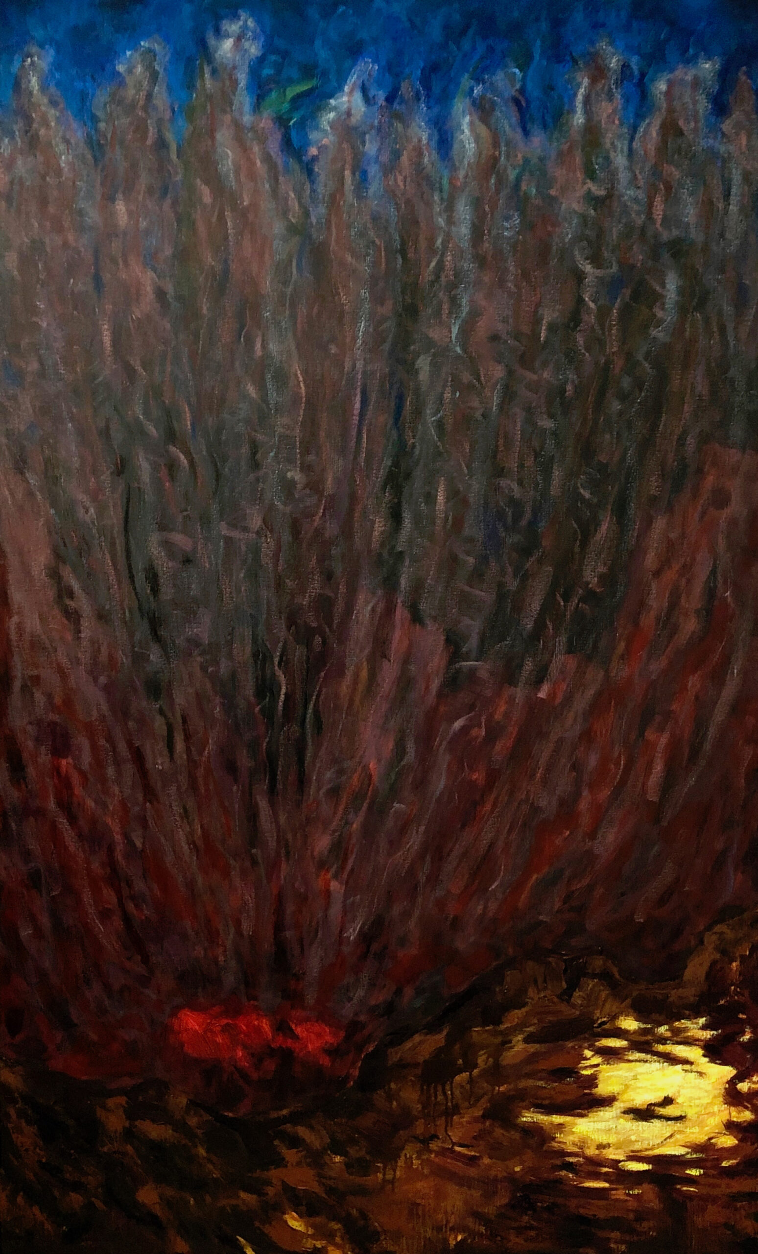 The work is a symbolic modern interpretation inspired by a part of the Revelations in the Bible. This work is part two of two works inspired by a particular part. Part one; The star falling from the sky opening the bottomless pit. Part two; The bottomless pit has been opened and the smoke coming from it is blacking out the air and sun.
